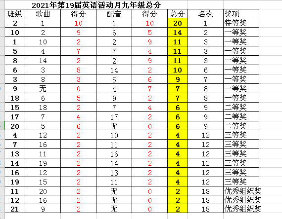 第19届校园英语文化活动月九年级团体成绩成绩揭晓