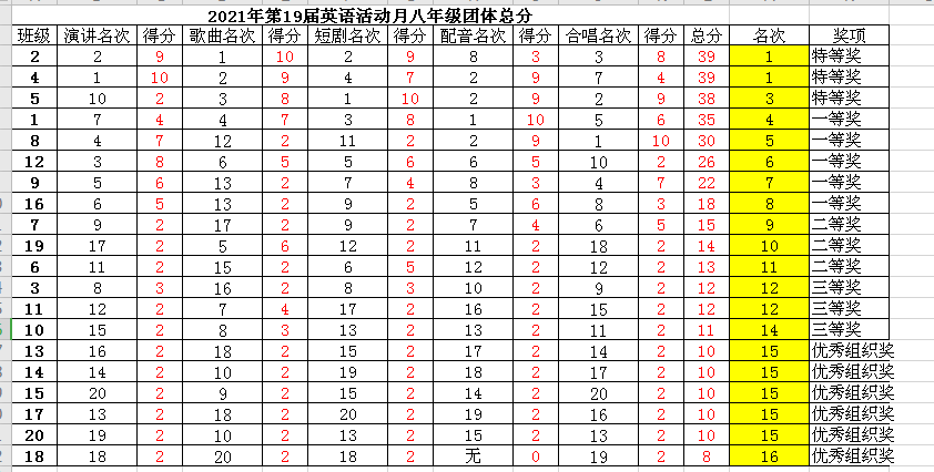 第19届校园英语文化活动月九年级团体成绩成绩揭晓