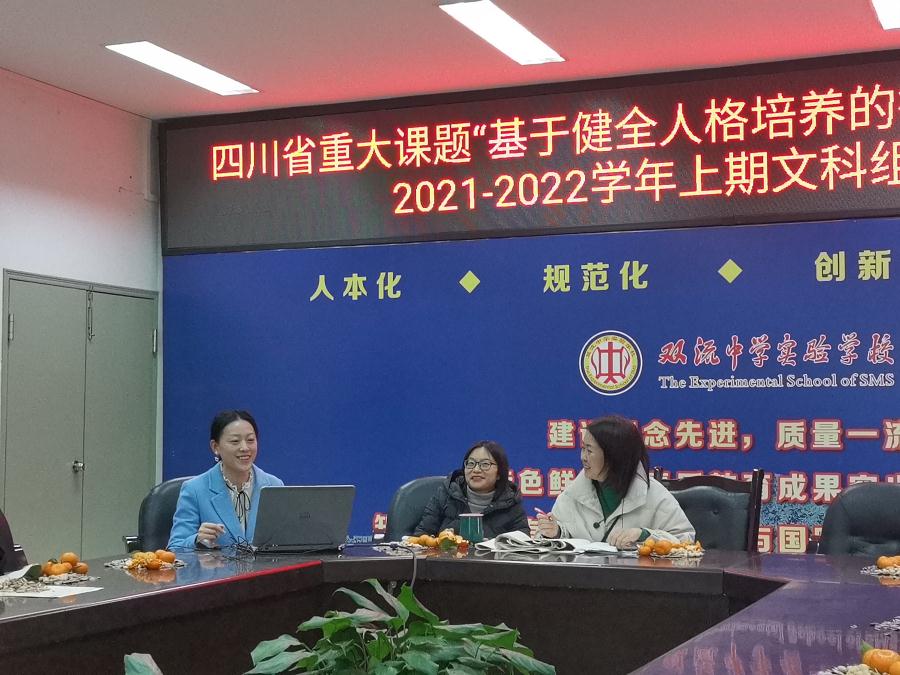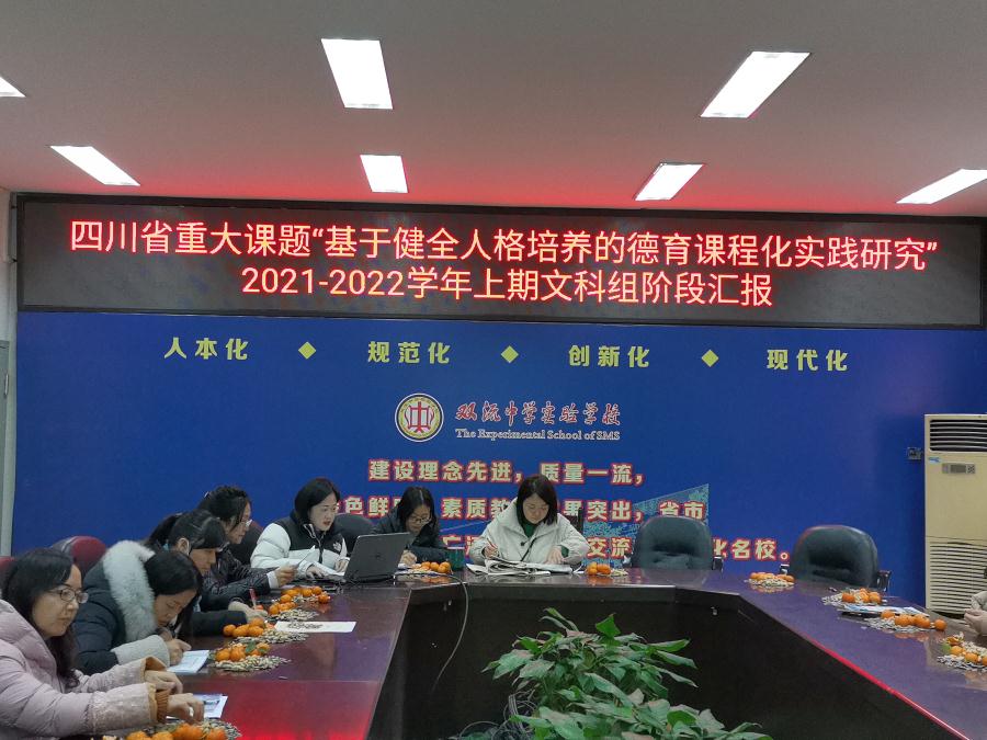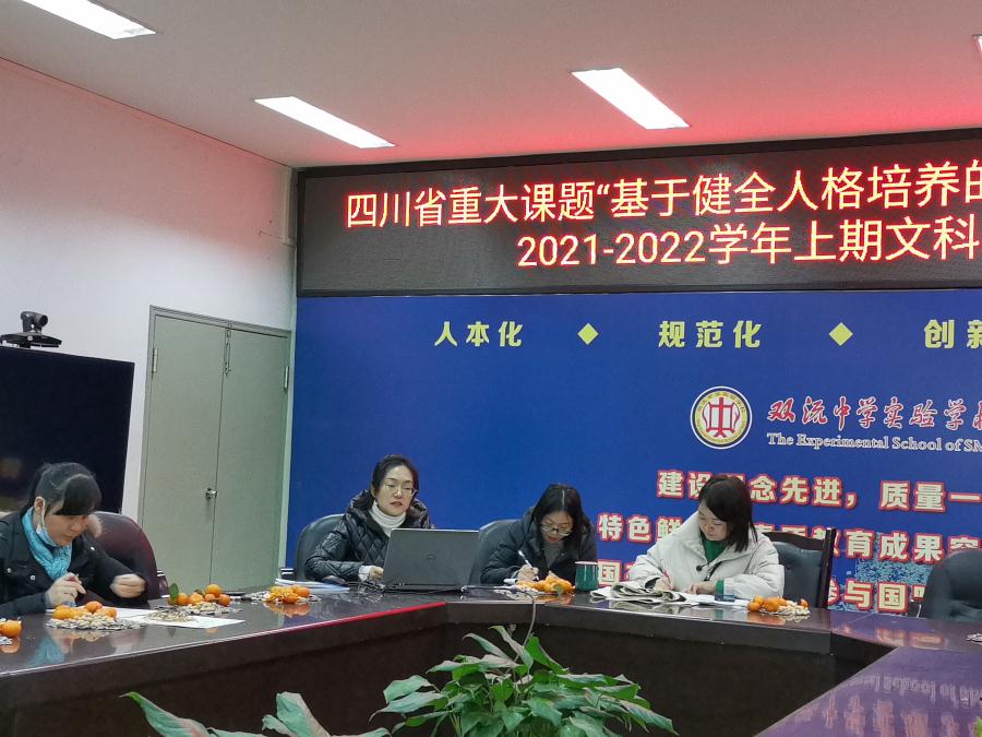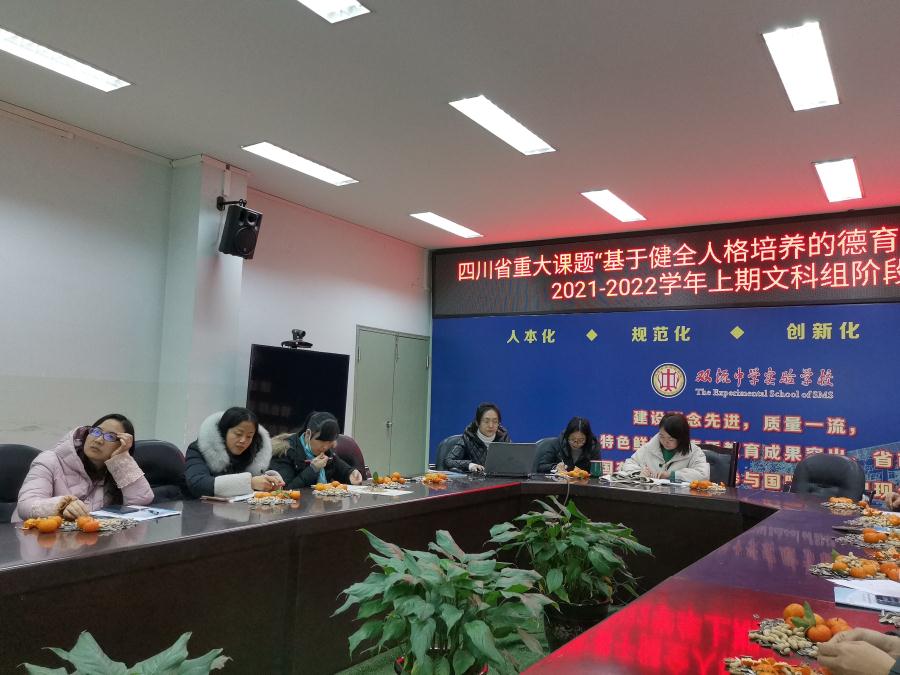 2021年12月22日下午4:00,“四川省重大课题‘基于健全人格培养的德育课程化实践研究’ 2021-2022学年上期文科组阶段汇报”会议在星空在线登录官网三会议召开。来自语文、英语、道德与法制、历史、地理、艺术六个学科的教研组长和课题研究骨干教师,在文科组长张玉萍老师的主持下参与了会议。