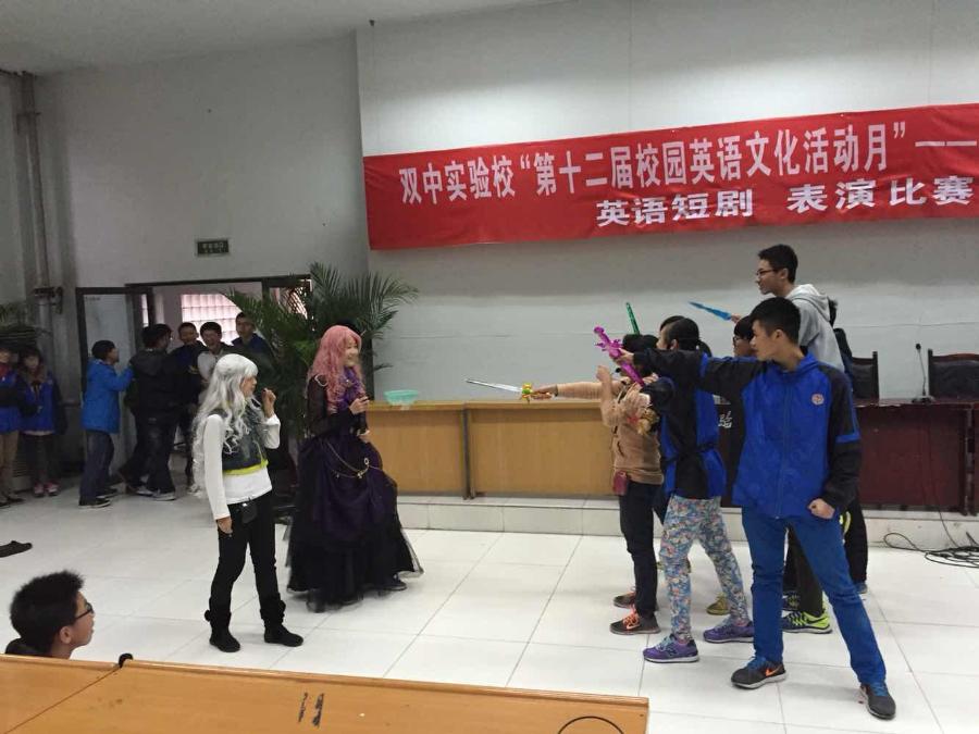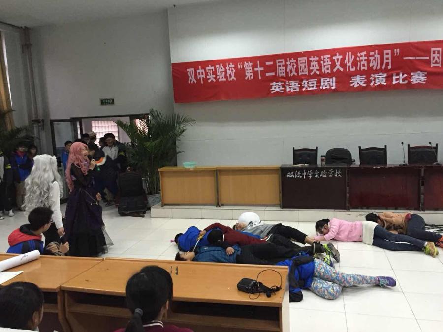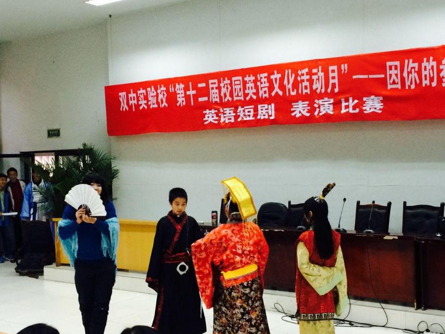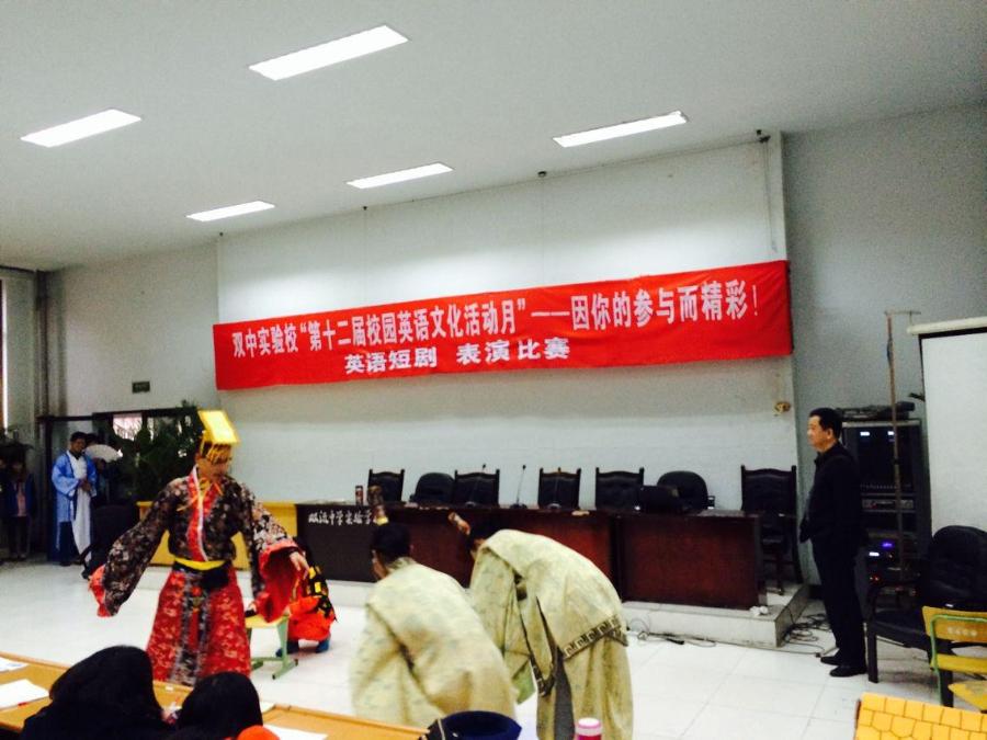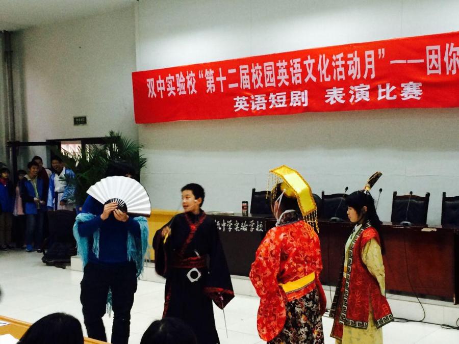 2014年12月3日下午,我校9年级同学在学术演讲厅参加了第十二届校园英语文化活动月的英语短剧表演比赛。英语短剧表演一向是活动月中最受同学喜爱的传统节目之一。本次比赛吸引了相当大一部分同学的积极参与,也吸引了众多粉丝们的追捧,表演期间,整个学术演讲厅里座无虚席。