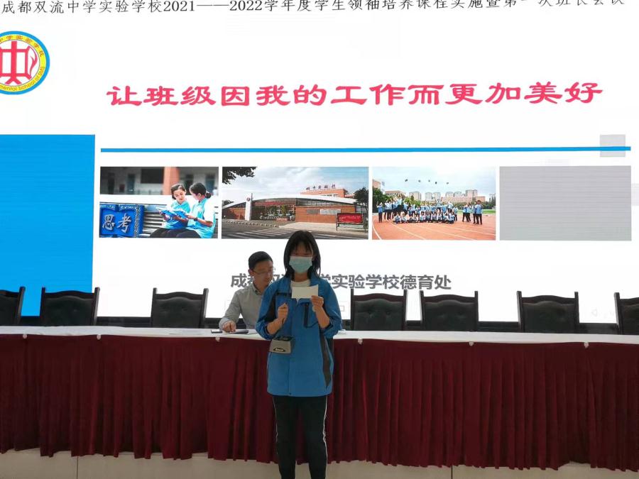 德育处雷蓓蕾老师向班长们传达了学生成长档案填写的重要性和填写方法,要求大家组织班级同学积极参加学校活动,注意平时资料的收集,及时填写感想与收获;德育处彭钰老师就各班近期教室卫生和大课间活动检查情况作了总结通报,并对本学月班级文化建设检查相关要求进行了说明。