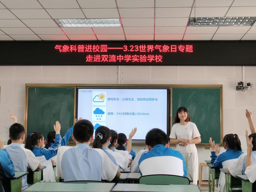 3月23日是第62个世界气象日,今年的主题是“早预警、早行动”。由于气候变化,世界上许多地方的极端天气、气候和水事件正变得越来越频繁和强烈,我们比以往任何时候都更容易受到多种相关危害的影响。为了大力普及气象知识,弘扬科学精神,在气象日来临之际,我校地理组向敏、刘晋希老师携手成都市气象局赵静、许晨两位高级工程师及双流区气象局科普成员李昭霞、廖利娟老师为我校学生科普气象知识,同时让孩子们学习在气象防灾减灾中的应对措施。