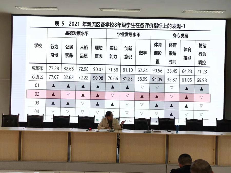 德育处王敏蓉主任首先分析了2021年双流区中小学教育质量综合评价结果,指出了我校在测评中反映出来的问题,建议大家针对问题思考如何建立友好、和谐的班级和校园成长氛围,更多地认可和赞扬学生日常进步,让学生在校园中产生积极的情感心理体验。随后王主任通报了本学月学生自主管理各方面的反馈情况:值周班级同学积极开展校园自主管理工作;自主管理班级在没有老师的情况下都能规范地整队进入食堂就餐,且就餐时秩序良好。在九年级体考结束之后,学校将试点实行学生大课间自主管理。王主任希望各班都能够积极申请,引导学生参加学校组织的各项活动,丰富自己的成长经历,提升自己的自主管理能力。