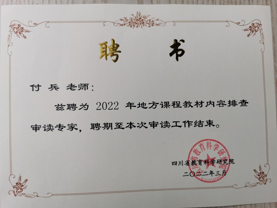 2022年3月25日,我校语文教研组组长付兵老师被四川省教育科学研究院特聘为2022年地方课程教材内容排查审读专家,这是对星空在线登录官网教育教学工作的肯定,给予了我校极大的鼓励和动力,也将鼓舞更多更优秀的语文老师提高和发展自己的专业和科研能力。