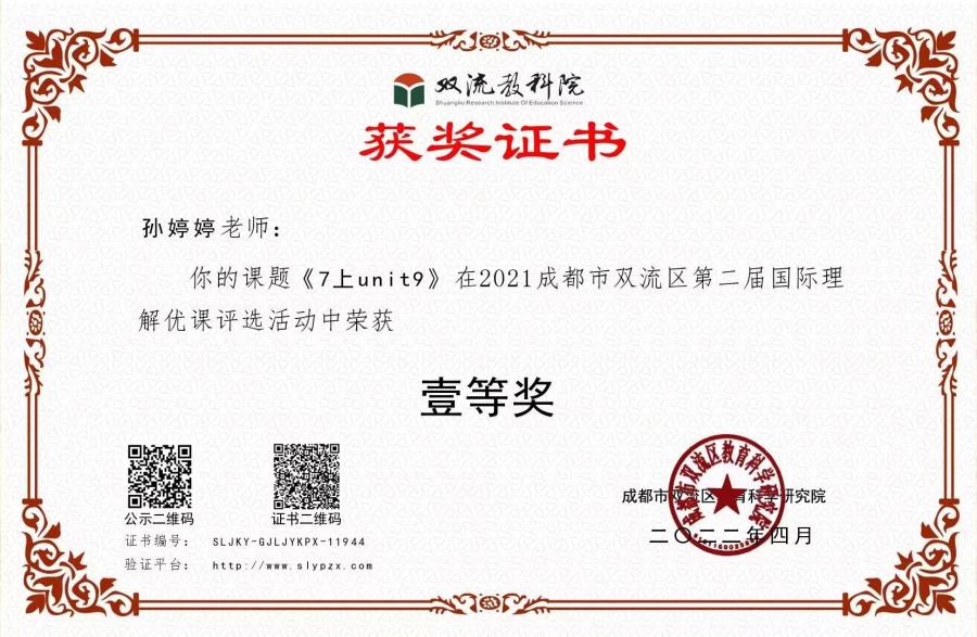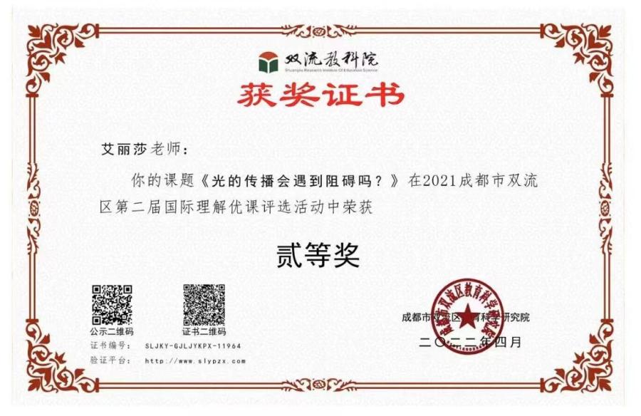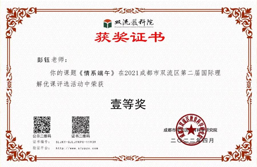 近日,双流区教科院公布了2021成都市双流区第二届国际理解优课评选结果,我校初中部彭钰老师的课题《情系端午》和孙婷婷老师的课题《7上unit9 My favorite subject is science!》均获得一等奖,我校小学部老师艾丽沙的课题《光的传播会遇到阻碍了吗?》获得二等奖。