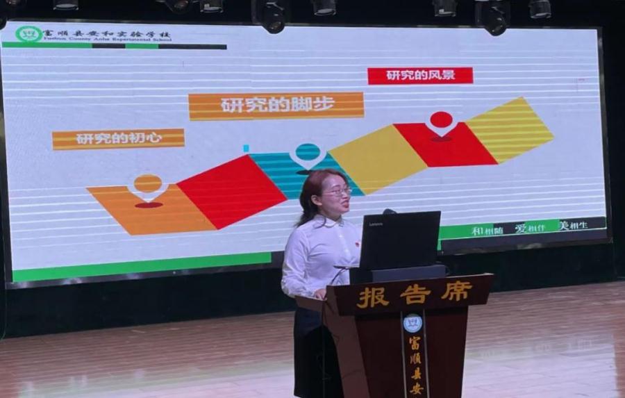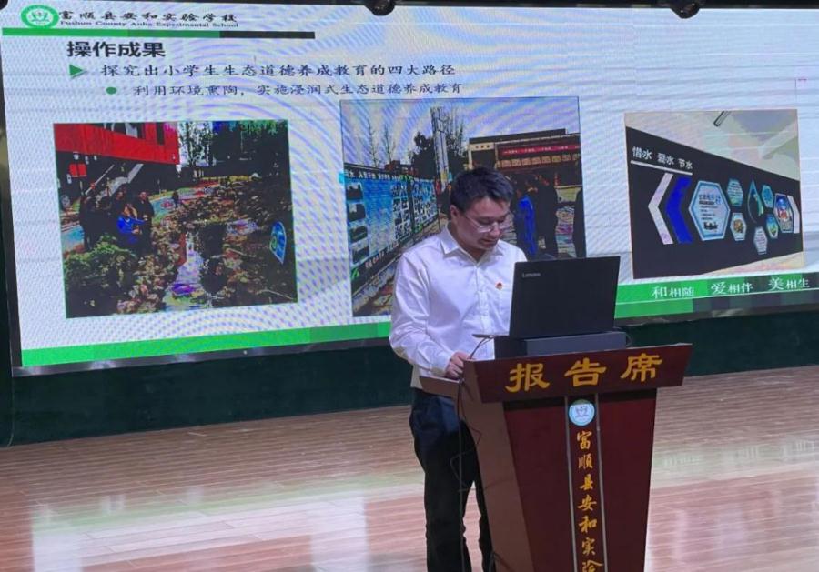 富顺县安和实验学校课题组主研教师张业存、陶玉梅、范世君进行了《小学生态道德养成教育实践研究》成果分享。