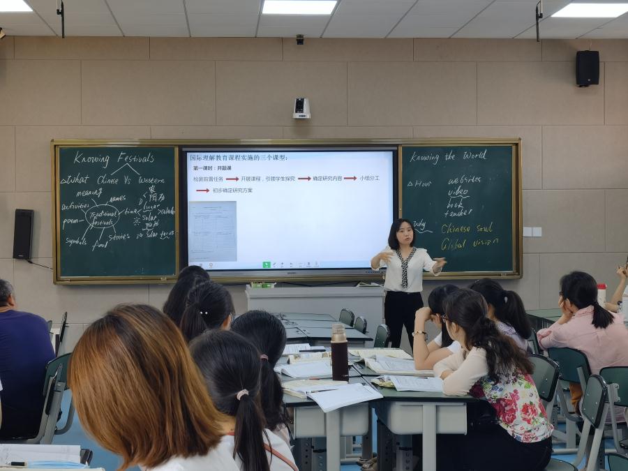 议程第一个环节,孙婷婷老师上课。上课本节课内容为中西方传统节日比较研究的第一课时:开题课。学生在课前完成了课前任务单,查阅了中西方具有代表性的传统节日的中英文名称及庆祝日期,并思考了关于节日可以从哪些方面了解和探究。通过头脑风暴和配对游戏孙老师对学生的前置学习任务进行了检测;通过知识挑战的形式检测学生对一些典型节日的了解程度并引导学生进行深入思考发现探究点,同时通过生成性思维导图板书的方式呈现每个知识挑战所涉及到的节日方面,如时间、历史渊源、文学作品、庆祝方式、典型食物、标志物、节日意义等。然后观看一个视频,了解到中国最重要的节日春节和西方最重要的节日圣诞节有一些共同之处,所以可以进行对比研究。紧接着让学生思考今天呈现的中西方传统节日哪些可以进行对比研究,布置任务。最后让学生进行文化探讨,孙老师最后进行点评,引导学生培养辩证思维,不断学习,拥有中国灵魂和国际视野。