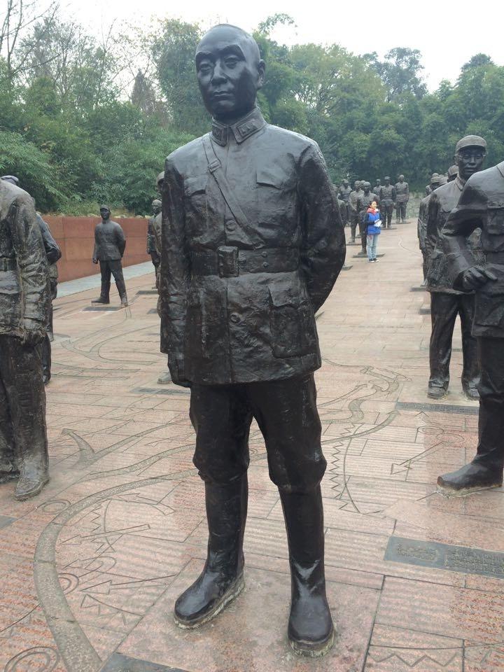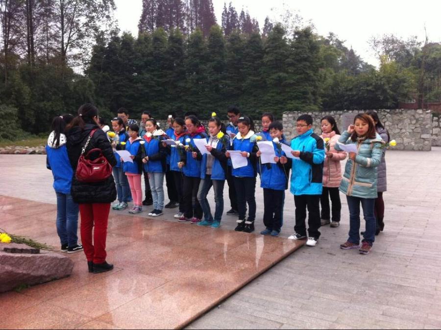 9点30分师生一行到达大邑县安仁镇建川博物馆,前往壮士群雕广场,同学们手持鲜花,庄严地向死难者和英雄致敬。
