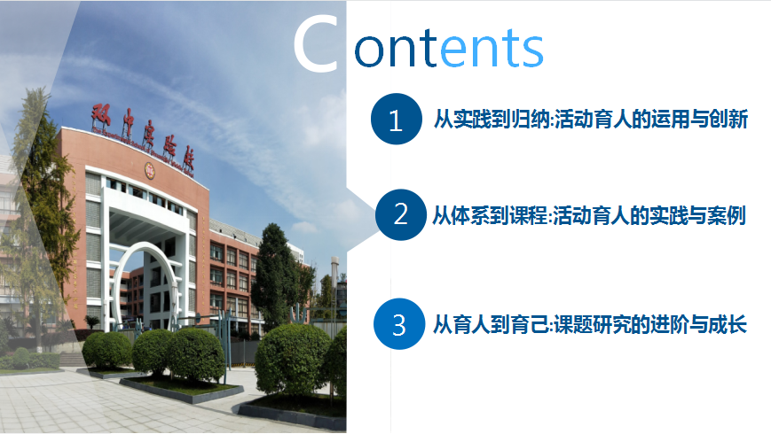 在课题汇报的第三部分,王俊老师介绍了课题研究带给课题组老师们的成长,课题组9名老师,来自于不同学科,不同年级,在课题研究和活动实践中不断成长,现在都分别成为相关课程的设计者和负责人。王俊老师也分享了课题研究带给他的三方面的成长:一是从“菜鸟和小白”成长为一名“健全人格教育的新秀”;二是从活动幕后参与者成长为到活动设计达人;三是从育人初心成长为育人名师。王俊老师始终坚信每个学生事件的背后都蕴藏着丰富的育人契机,也努力成为学生认可的“心中有爱、眼中有光、严爱结合”的德育名师。