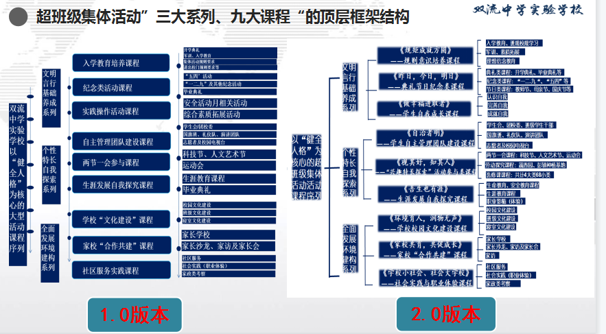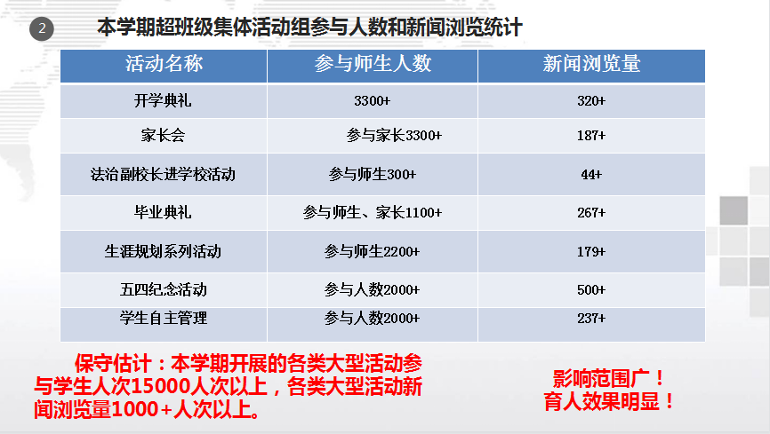 接下来,王俊老师向大家阐述了我校独创的超班级集体活动概念和内涵,并介绍了超班级集体活动“三大系列、九大课程、若干活动群”的顶层设计2.0版本,介绍了课题组老师研发的人格要素水平层级的表现描述,人格要素水平层级描述引起了高校长的关注和询问。在汇报的第二部分内容——活动育人的实践与案例中,王俊老师向大家介绍了全部九大课程的典型案例和活动,充分展现了本学期课题组开展的扎实的工作和育人效果。据不完全统计:本学期开展的各类大型活动参与学生人次15000人次以上,各类大型活动新闻浏览量1000+人次以上。真正实现了影响范围广,育人效果明显的特点。