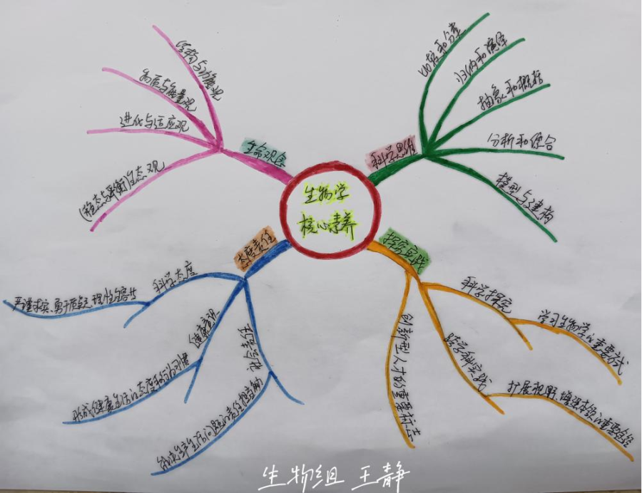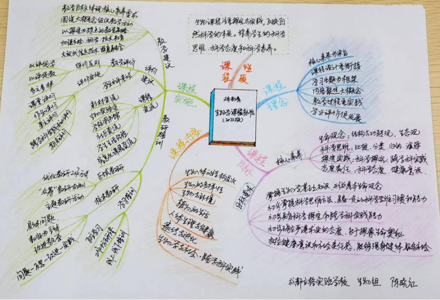 学习交流生物课程标准后,生物教研组的老师根据自己的理解绘制了本学科新课标关键问题思维导图,促使自己更好地理解新课程标准的目的和意义。