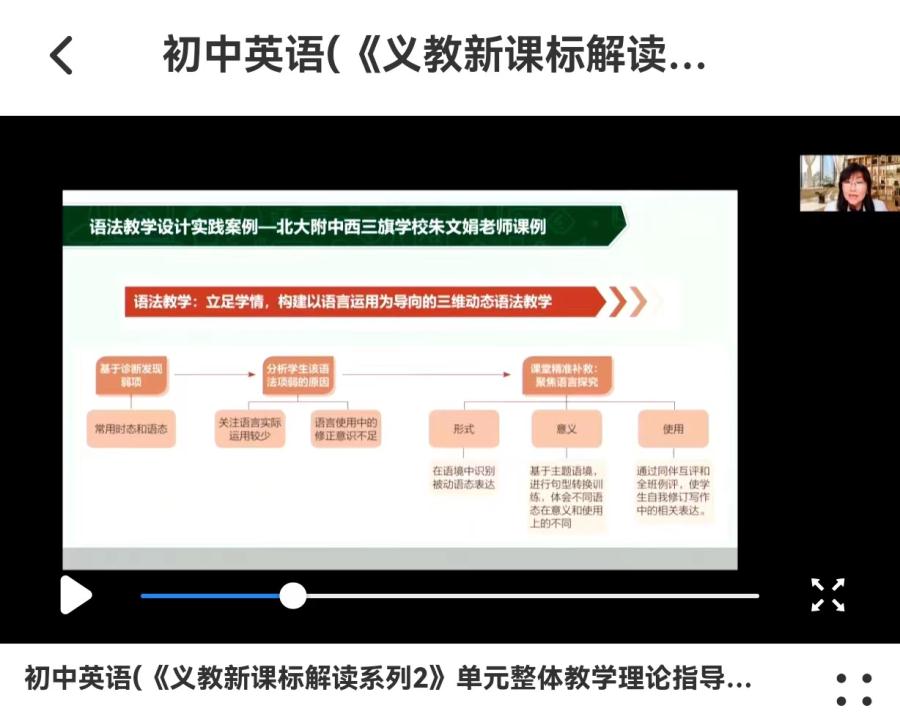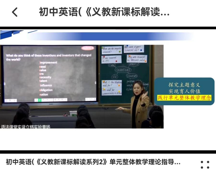 然后,代君老师在《基于主题意义探究的单元整体教学》讲座中,特别强调了一线教师在开展教学活动时要有两个意识--“育人”意识以及“单元”意识。首先是“育人”意识。初中生是快速成长中的青少年,正处于人生的关键阶段,作为一线教师,要引导他们在人生的这个关键阶段,在学习和运用英语的过程中,通过学习跨文化视域下的人文、科学等丰富的知识,习得优秀的文明和文化成果,实现原有知识的重构和丰富,逐步由外向内,转化为自身的思想内涵和个体的品格和行为,最终学会运用所学语言、思想、观点和方法,尝试解决现实生活中的新问题,学会认识自我,接纳他人,了解社会、知晓世界,加深对中华文化的理解,增强文化自信,形成正确的价值观、必备品格和关键能力,成为全面发展的人。其次是“单元”意识。教师要基于课程标准,围绕特定主题,对教材等教学资源进行深入解读、分析、整合和重组后,结合学生主体的需求,搭建起的一个由单元大主题统领、各语篇子主题互相关联、逻辑清晰的完整教学单元,使教学能够围绕一个完整的主题设定单元目标,引导学生基于对各单独语篇的学习和提炼,逐步建构基于该单元主题的结构化知识体系。