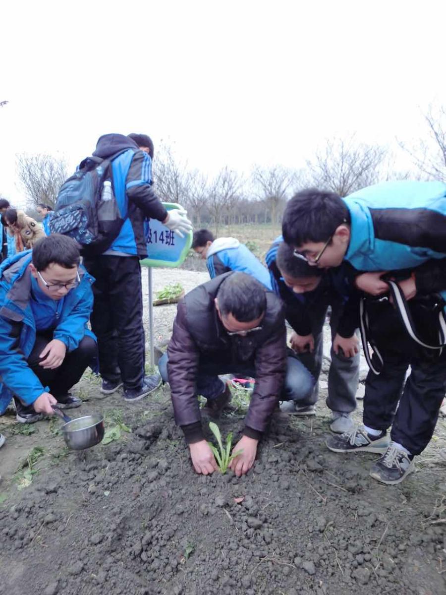 1月5号至1月7号三天下午的1:30~5:30,我校八年级共22个班学生分三批依次到彭镇基地进行了蔬菜种植活动,每个班分六个小组,分别种植了莲花白、莴笋、瓢儿白、包心芥菜、菠菜和生菜。从锄草、翻地平土、量度行距、打窝到直播移栽、培土浇水整个种植活动都是由学生在专业技术人员的指导下完成的。