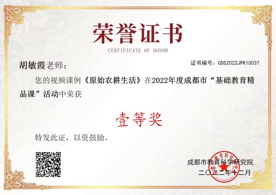 2022年12月,成都市教育局组织开展的成都市2022 年“课堂教学大比武”暨“基础教育精品课”遴选活动落下帷幕。经过自主申报、学校推荐、县级初选、市级遴选,我校历史组胡敏霞老师视频课例《原始农耕生活》获得成都市一等奖。