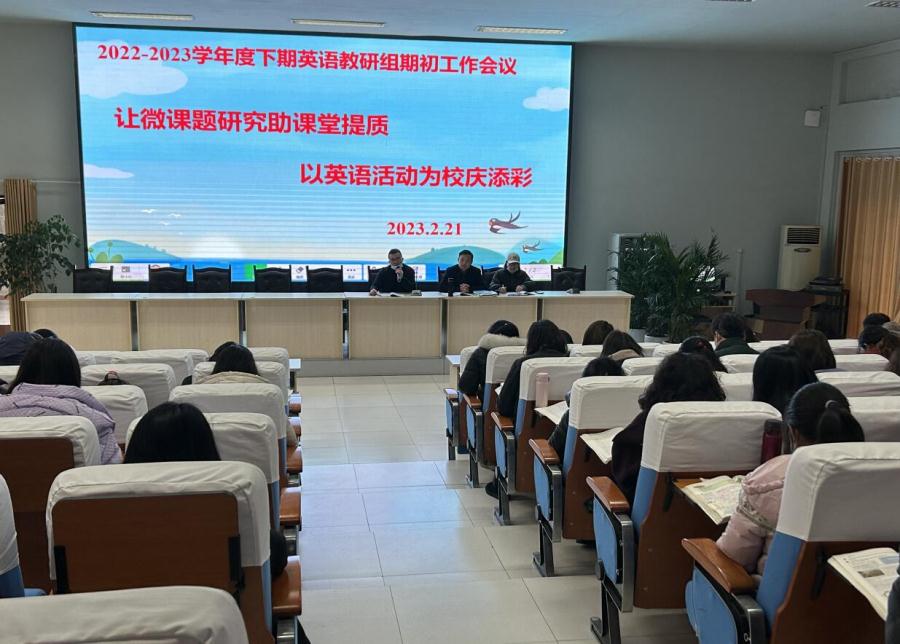 2月21日上午10:00,本学期第一次教研组大会在学术演讲厅如期召开,参加本次会议的有学校行政领导杨红主席和李征主任,教研组长代君,谭虹涛以及初中全体英语组老师。会议在教研组长代君对上期工作的总结和本期工作的安排部署中拉开帷幕。上期,在新冠疫情的冲击下,全体英语组成员紧密团结,在代君组长和谭虹涛组长的带领下,我们取得了喜人的战绩。在对本期工作的指导中,两位组长再次强调以素养为本,提升常规教学质量的重要性。此外,老师们还应该时刻牢记终身学习的理念,并且坚定英语学科的育人地位,以学生为中心,做到学思结合教学。