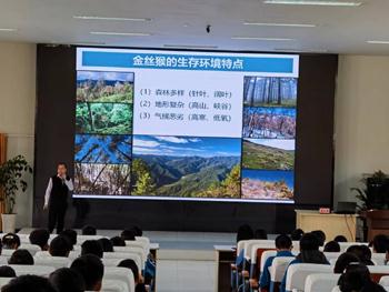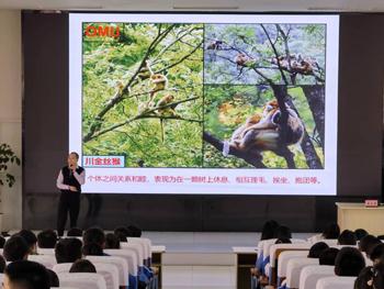 在一个小时的科普讲座中,黎教授从灵长类的特征、金丝猴名字的由来、金丝猴生活的区域、金丝猴的食谱等方面,详细的为同学们介绍了金丝猴的特征、社群结构、生活习性。同时黎教授也从一个研究者的角度向同学们展示了进行动物学研究的一些科学方法和技巧。通过黎教授的介绍,同学们不仅了解到金丝猴的“前世今生”,也感受到了科学研究的快乐与艰辛,更激发了同学们追逐科学的信念,精彩的讲座点燃了同学们对科学的好奇。在黎教授与同学们的交流互动中,同学们积极举手提问,发表自己的观点。有的同学提出“金丝猴为什么会有一雄多雌的家庭单元社群结构”,有的同学则对“金丝猴的厚鼻所代表的意义除了年龄还有哪些”提出了疑惑,还有同学提出“松萝(树胡子)是有毒性的菌类为什么金丝猴食用后却不会中毒”等等。黎教授耐心的为同学们解答了问题并表示同学们的问题非常有价值,一些问题甚至是他们即将研究的课题内容,直到讲座结束,许多同学都还感到意犹未尽。