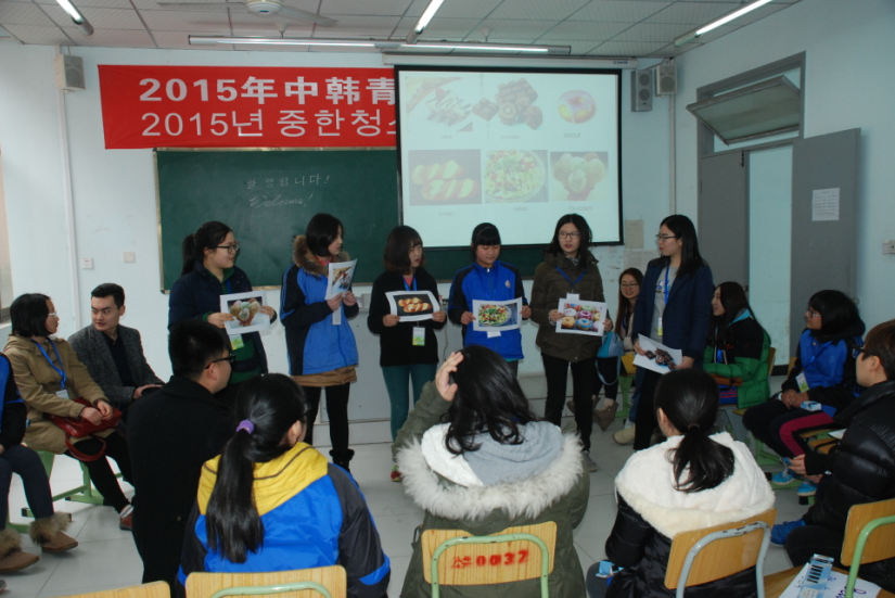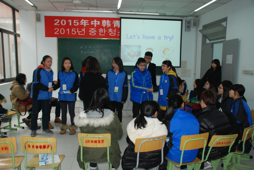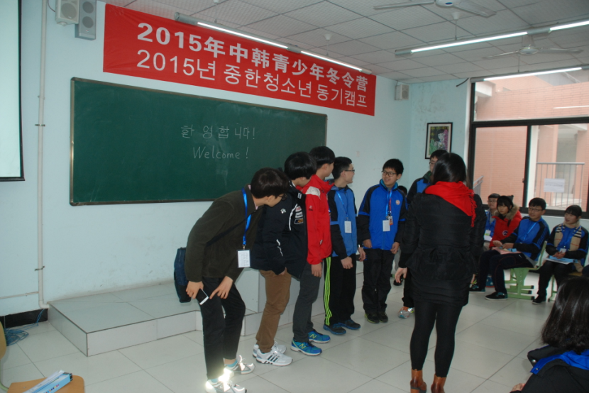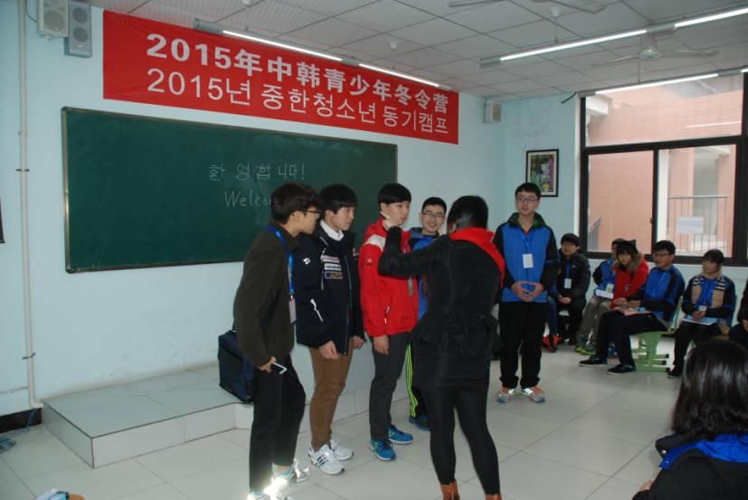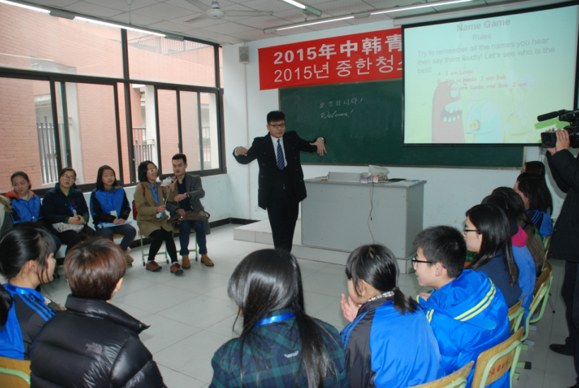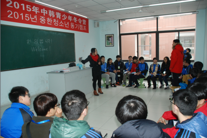 2015年1月19日,来自韩国光州的2015年中韩青少年冬令营全体师生抵达我校。我校英语组刘抒雨老师,徐然老师和杨四维老师分别为韩国学生上了一堂别开生面的英语活动课。