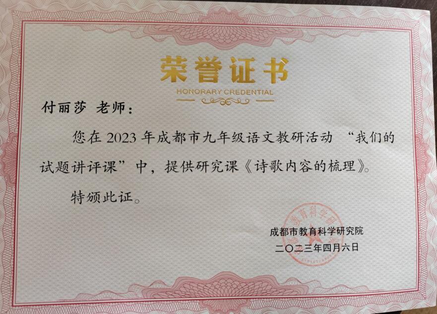 为促进全市初三年级语文复习备考工作顺利且有效地进行,4月6日上午8:50,成都市九年级语文教研活动“我们的试题评讲课”如期现场举行,并全程进行全网直播。我校付丽莎老师代表双流区受邀参加诗歌版块试题评讲,执教研究示范课《诗歌内容的梳理》。