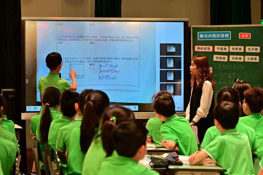 成都立格实验学校附小杨蕴老师执教六年级《画图解决问题的策略》,充分给予学生时间和空间去自主探究,合作交流汇报。她将附小自主研发具有校本特色的导学案在课堂中灵活运用,设置了不同难度的练习题让学生自主选择,让不同层次的学生得到了不同的发展。