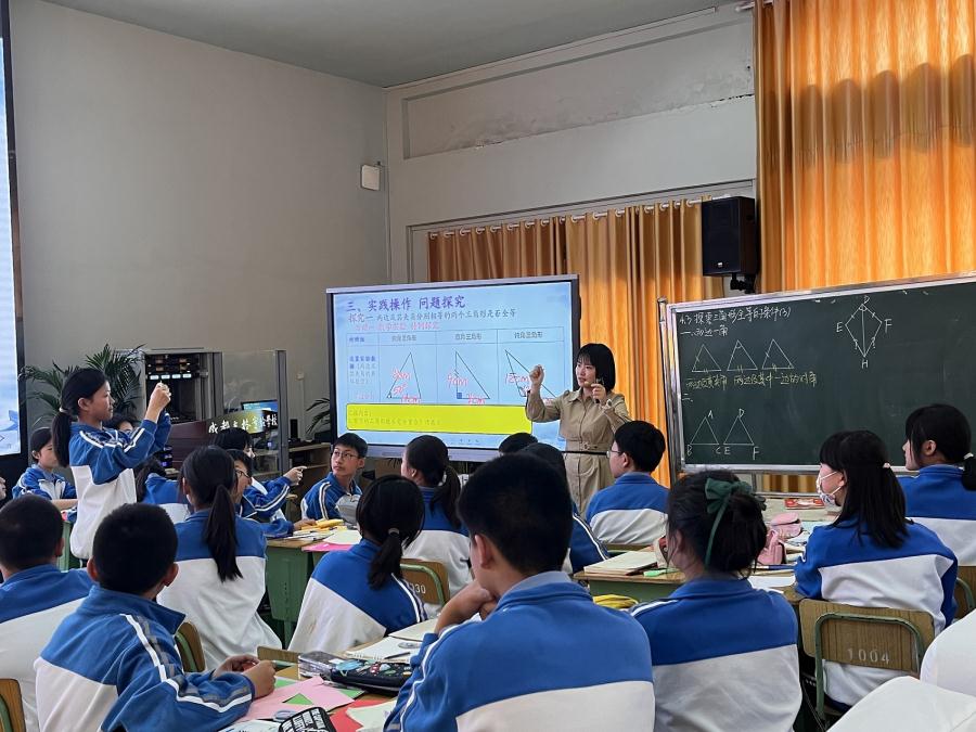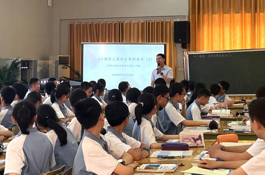 成都立格实验学校罗霞老师和成都树德中学光华校区肖德军老师对《探索三角形全等的条件》进行同课异构展示。罗霞老师依据新课标,巧用教材,以大任务为抓手,以数学实验和微课题的探究为主要学习方式,让学习在课堂上真正发生。肖德军老师高站位、精设计、细引导,充分理解新课标,精准分析教材内容和立意,在实施中巧设问题串,引导学生独立操作,小组交流,渗透数学核心素养。