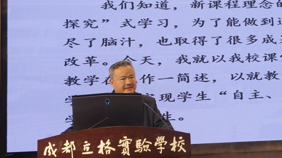 随后,四川省特级教师,四川省劳动模范,成都立格实验学校党委书记高志文校长做了主题为《学科微课题开发与实施》的主题报告,向与会嘉宾展示了成都立格实验学校“以课程改革为核心”的素质教育模式,系统介绍了本校课堂教学改革实践的最新成果——微课题教学探索与实践。高校长深入阐述了微课题教学的意义与价值,具体分析微课题设计与实施策略,反思当前面临的问题和后期研究方向,带给嘉宾新的启发与思考。