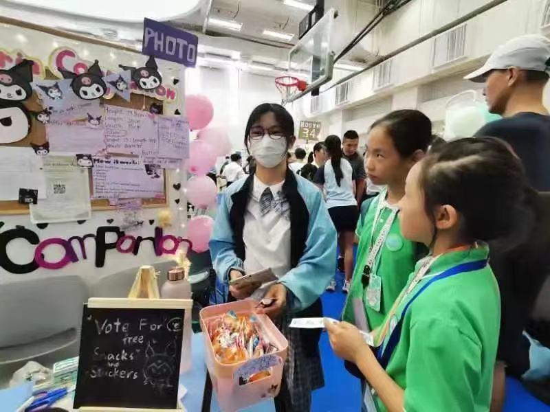 在往上走一层,就是这次开放日的重头戏了。每个学生都有自己的摊位,而摊位的主题是围绕一个话题研究来布置的摊位。所以每个摊位的主题不同,风格不同,挑战也不同。这次活动非常考验学生的组织能力和动手能力。有的摊位研究心理学,有的研究机器对人类的影响,有的摊位主题是漫画。更不可思议的是,所有摊位上的字都是英文。为了解决这个疑问,我问了一个小姐姐。她说,她们平时都用英文交流。这也是与我们学校不同之处。
