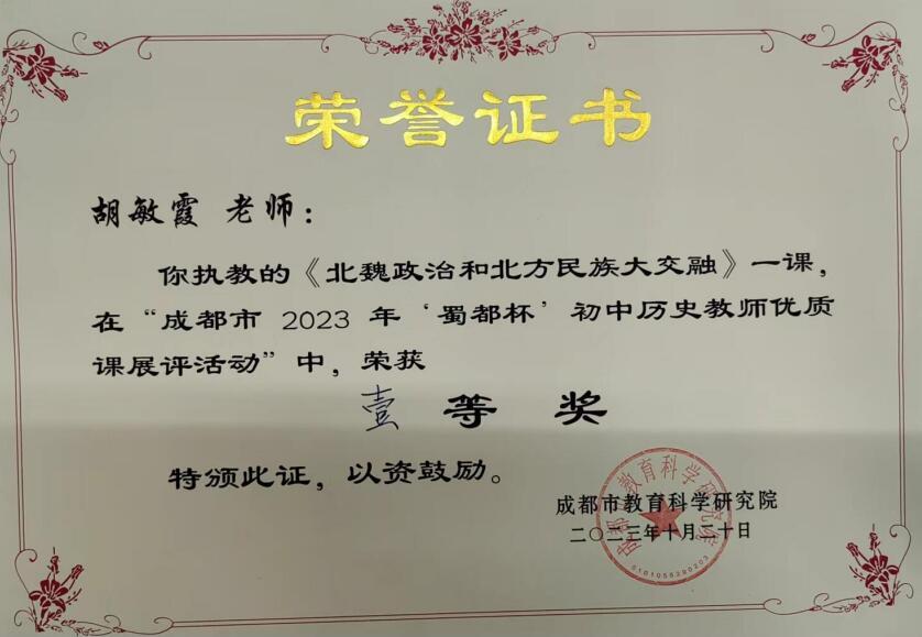 10月18日,成都市2023年“蜀都杯”初中历史教师优质课展评活动隆重举行,我校青年教师胡敏霞代表双流区参赛,经过激烈角逐,从29名选手中脱颖而出进入决赛,并获得一等奖!