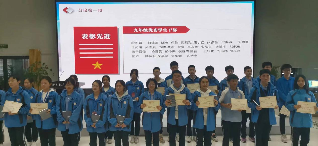 会议第二项:九年级优秀学生干部代表发言。在过去的一年中,学生会在成员的共同努力下日趋成熟,学生代表蒋可馨同学分享了工作经验。