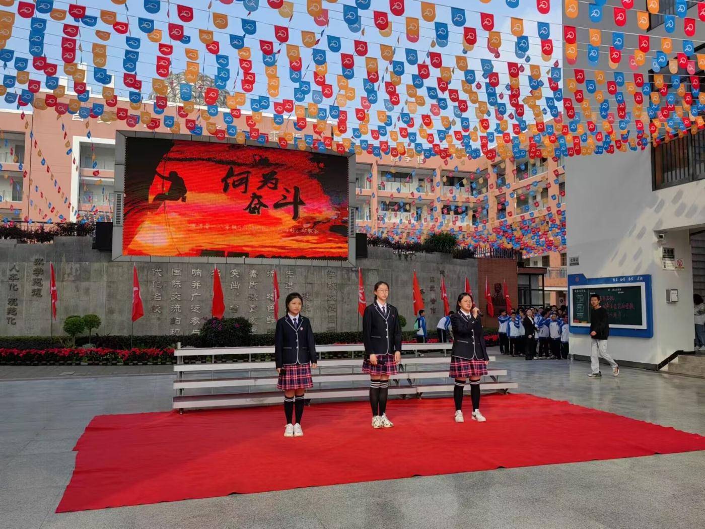 太阳门前,黄兰茜、宋子寅、 尹文心、范季鑫四位同学献上《重走:在公路、河流和驿道上寻找“西南联大”,》,他们以西南联大发展历程为素材,讲述了西南联大抗战烽火中的不辍弦歌。在战争风云之下,民族存亡之际,它临时拼凑而成,条件恶劣,衣食不充。虽有日寇轰炸,但他们赓续文文脉,弦歌不辍,书写了中国教育史上的奇迹,西南联大的发展与立格实验20年的奋斗相得益彰,赢得了与会校友的喝彩。