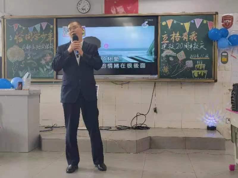 2023年11月4日,橙黄橘绿,秋风送爽,在这个美好的日子里,成都市立格实验学校建校20周年的校庆活动隆重举行,值此盛会之际,2024届年级组在分管行政领导副校长罗晓章,外事办主任李征,安全处副主任、年级组长黄智全的带领下,在九年级一二班教室召开了“立格有我”共话往昔岁月的校友茶话会。