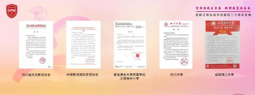 值此校庆盛典,成都立格实验学校收到了成都市教育局、四川大学、成都理工大学、四川师大、西华师大、成都四中、成都七中、成都九中、成都外国语学校、成都嘉祥外国语学校等全国及省市知名友好学校,中国民办教育协会、四川省教育学会、四川省民办教育协会等社会组织,中国香港浸会大学附属学校王锦辉中小学发来的贺信;还有哈佛大学、牛津大学、北京大学、清华大学等全球知名院校毕业的优秀校友发来的祝福视频。