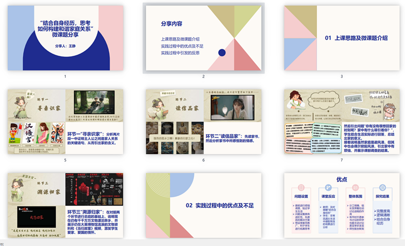 会议伊始,韩老师简要描述了近期各学科开展微课题教学的情况,各学科组都在积极地思考微课题教学怎样有效的设计和实施,并邀请了政治组的王静老师到课题组分享微课题的教学方法,王老师以教材上《家的意味》一课从中确定了微课题“结合自身经历,思考如何构建和谐家庭关系”,依据课标、教材、微课题教学,详细描述了设计思路,实施过程,以及在整个操作过程中存在的问题与不足。