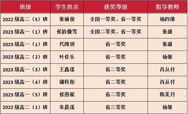 我校(两个年级共十个班)共8人入围四川省地区决赛,4人获得省一等奖,3人获得省二等奖,1人获得省三等奖。
