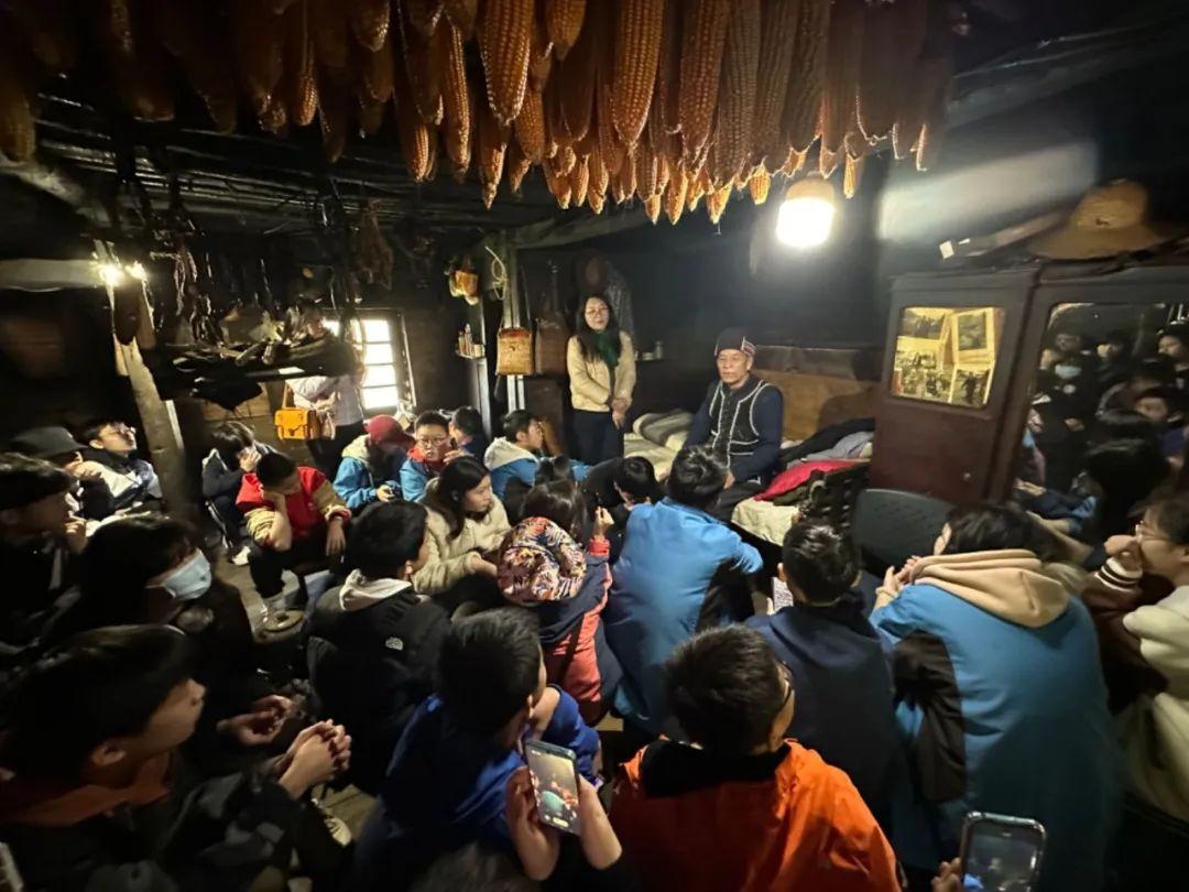 在阿者科古村落蘑菇房里,同学们围坐在温暖的火塘旁听非遗传承人马建昌老师讲诉他和哈尼哈巴的故事。