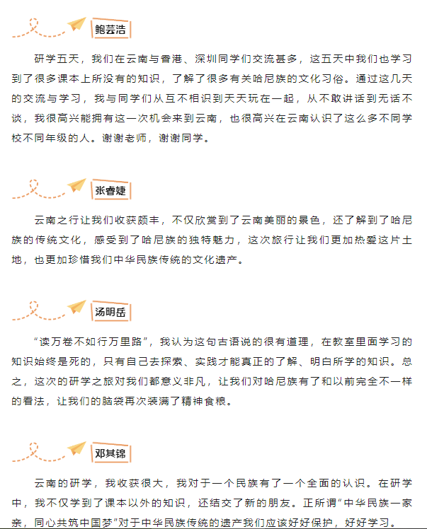 10位同学也查阅相关文献资料,对哈尼族有了初步的认识。“对于这次研学,我在一个月前就已经做好了接受精神食粮的准备,而这次研学之旅,确实让我我感到十分快乐,虽然大部分时间在大巴车上度过,但是我们每天学到的知识都让我非常快乐,同时我也能更加深入地了解云南哈尼族的各种文化和习俗。” 我校初二学生汤明岳在游记中写到。