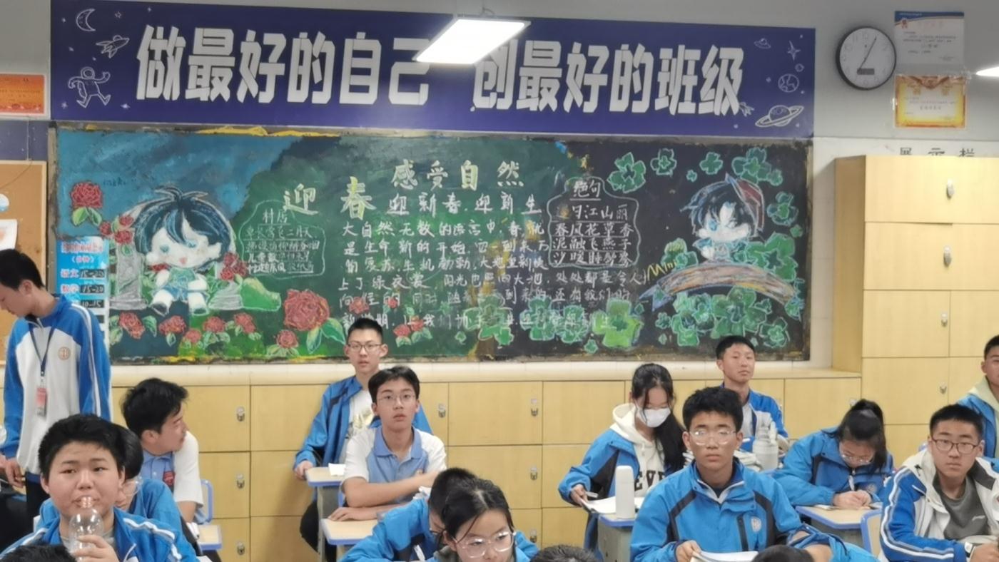 七、八年级的同学们紧扣“感悟春天的生机勃勃,憧憬新学期校园生活”的主题,黑板报上洋溢着盎然春意,绿意盎然的画卷描绘出生命的活力与希望。同时,他们积极响应“讲文明、树新风,用文明礼仪迎接新学期”的号召,将日常行为规范和传统美德融入创作之中,以图文并茂的方式倡导和谐有序、友善互助的校园风尚。