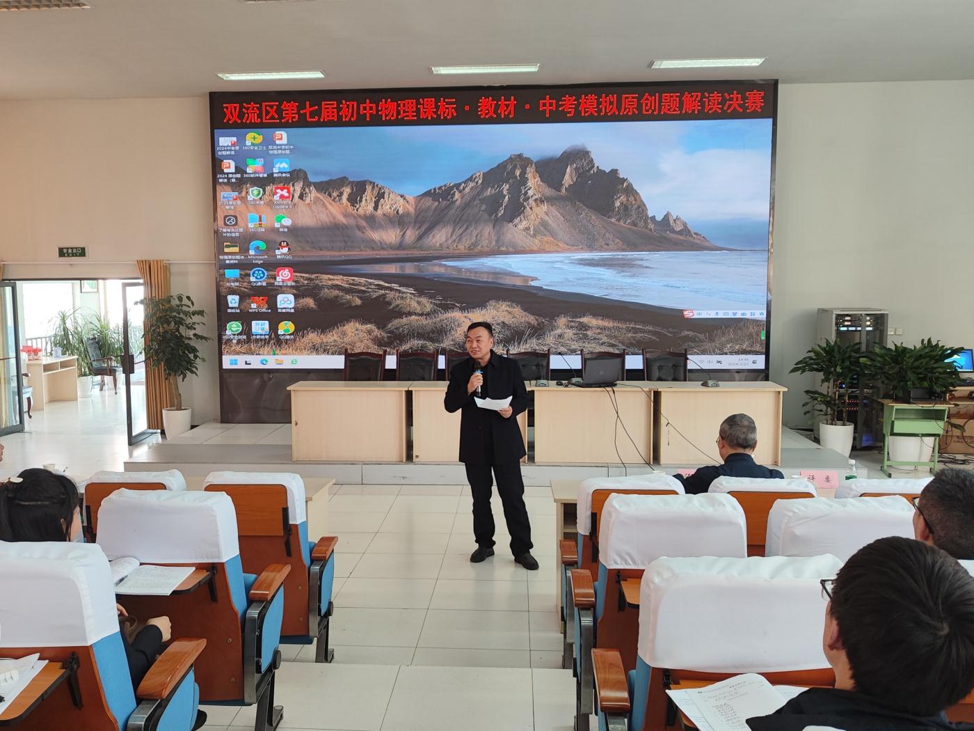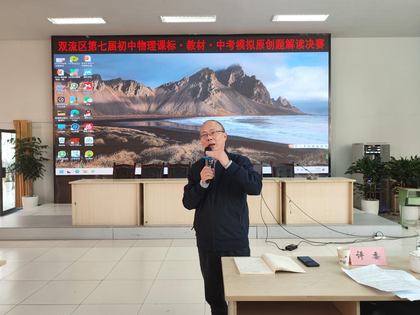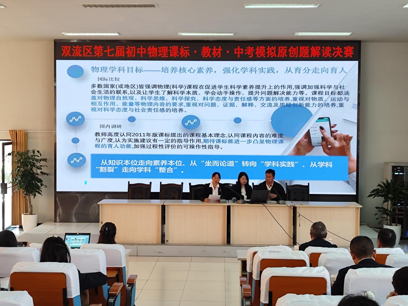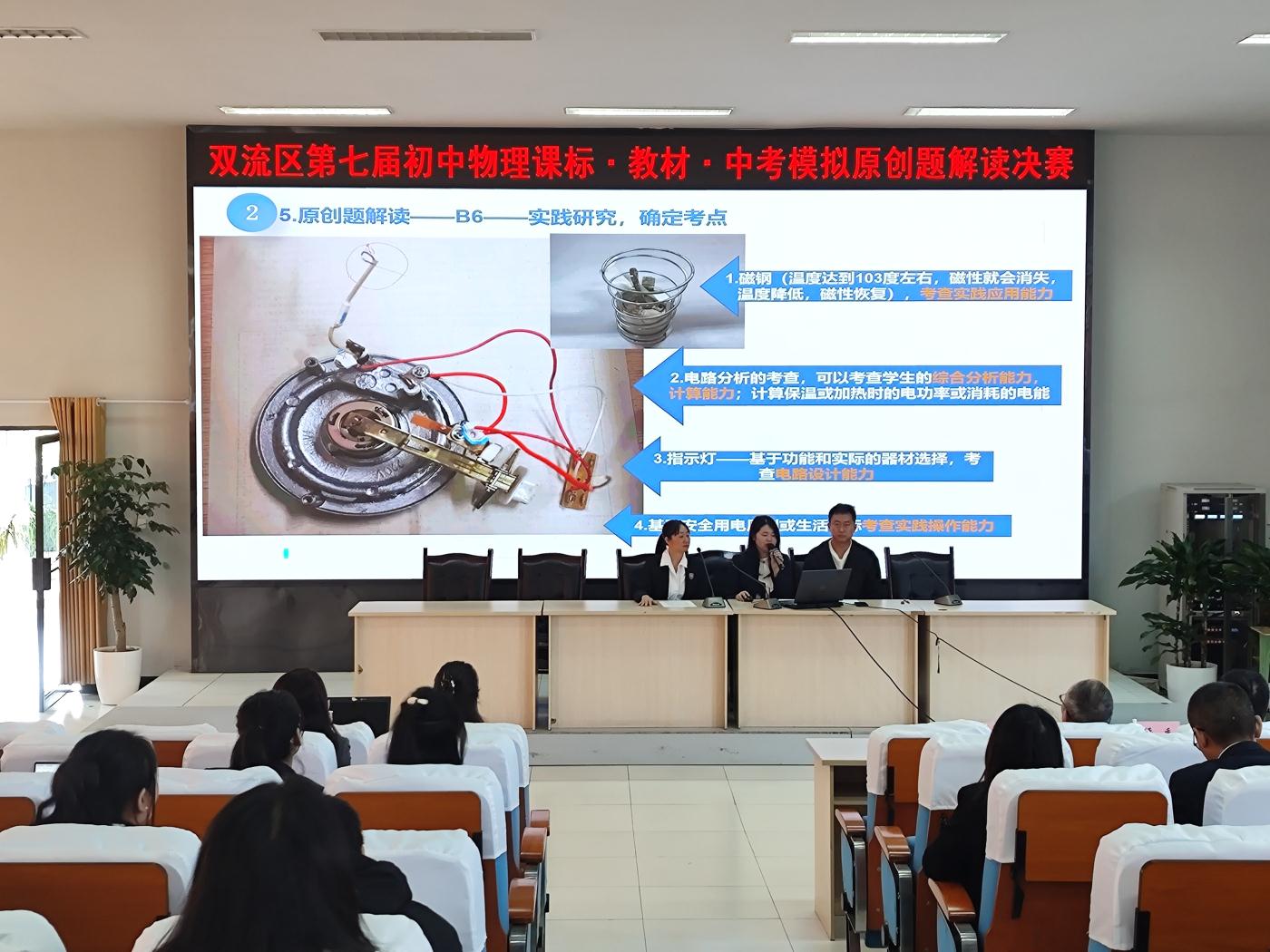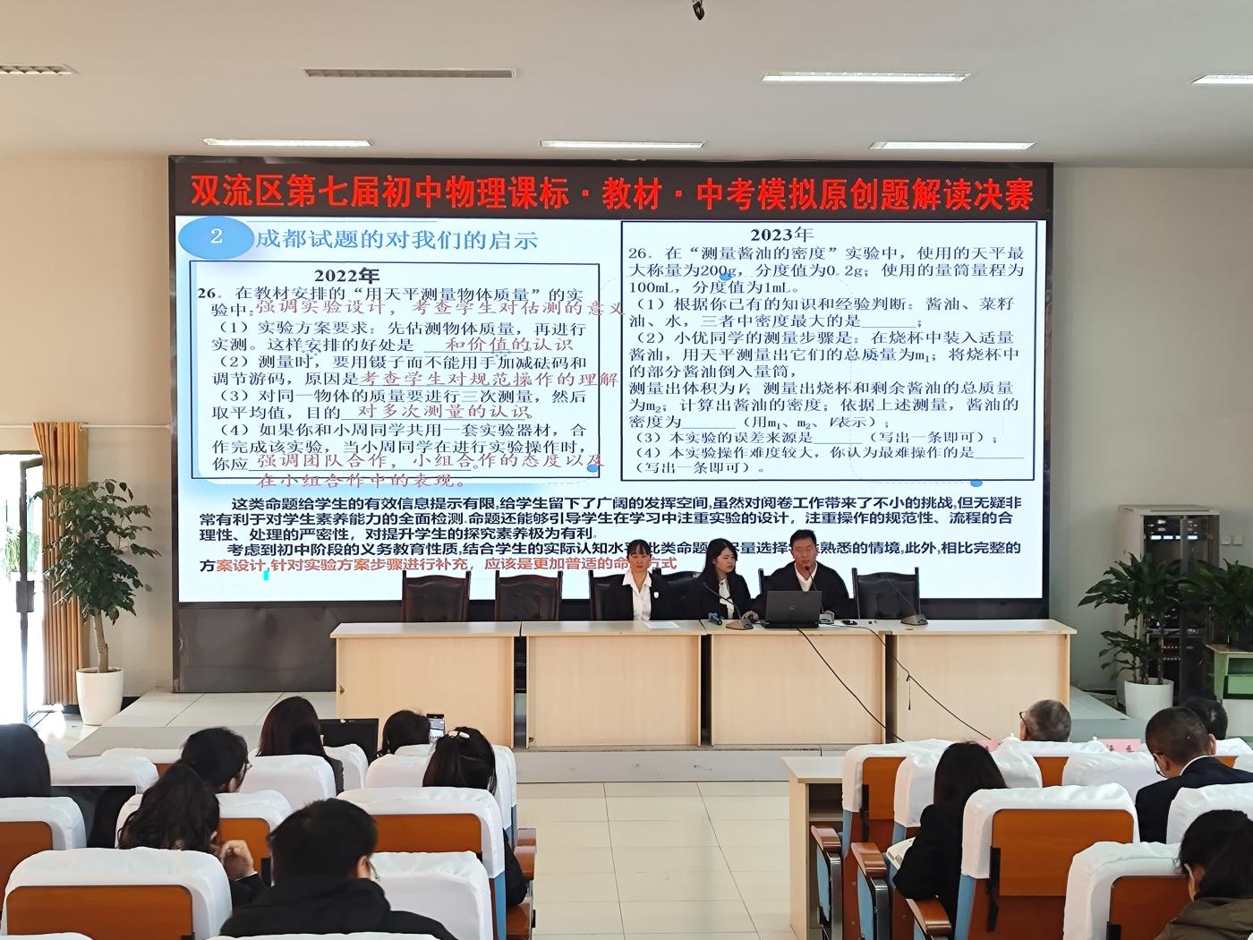 本次大赛特邀四川省初中物理教研员青春老师、成都市初中物理教研员郑其武老师、双流区物理教研员韩军老师等多位业内专家亲临指导;全区九年级物理老师共同见证和参与了这一学术盛宴。比赛现场,各学校代表老师围绕初中物理的课程标准、教材内容、学情分析以及中考模拟题的命题创新展开了深入的探讨和交流,分享了各自在物理教学过程中的宝贵经验和创新思路。我校2024届物理备课组教师代表李举梅、罗中华、何铁老师参加了解读。