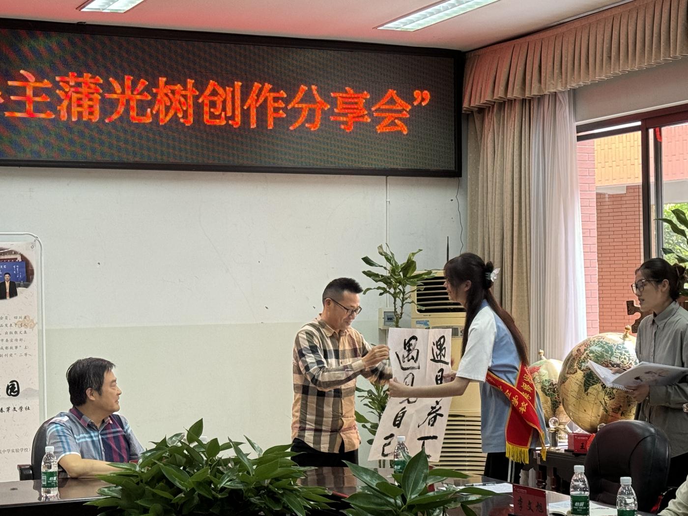 分享结束后,蒲光树先生向我校赠送了他的散文集《烤红薯、方便面与拉钩钩》。同时,我区著名书法家郭彦飞特意为本次活动送来书法作品《遇见春天、遇见自己》。