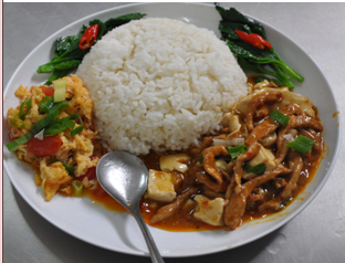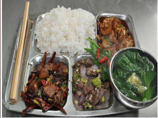 主食(米饭100g)、荤菜二个(肉75g,蔬菜150g,盐0.5g,食用油2g)、素菜一个(蔬菜75g,盐0.25g,食用油1g)、水果一份。