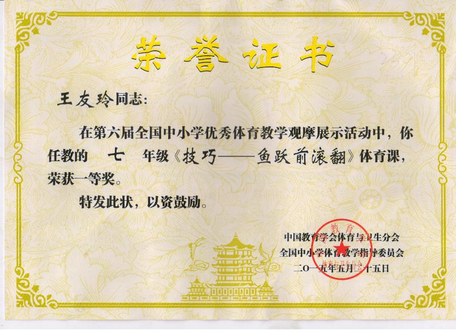 2015年5月20—25日,由中国教育学会体育与卫生分会、全国中小学体育教学指导委员会主办的“第六届全国中小学优秀体育教学观摩展评活动”在武汉体育学院举行。中国教育学会体育与卫生理事长杨贵仁、教育部体卫司原副司长、首都体育学院曲宗湖教授和季浏教授莅临大会指导,各省市教科所体育教研员和学校体育骨干教师代表参加了本次大会,我校优秀青年教师王友玲执教的七年级《技巧——鱼跃前滚翻》体育课荣获全国一等奖。