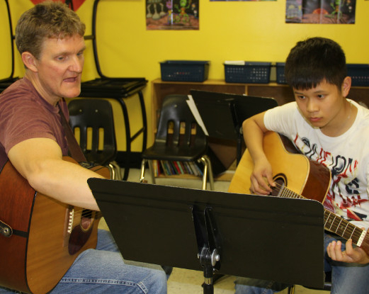 这个高大的美国老师,最喜欢单腿跪膝边弹吉他,边给学生讲解,还边弹边唱,可惜由于语言障碍,精髓的东西学不到啊!