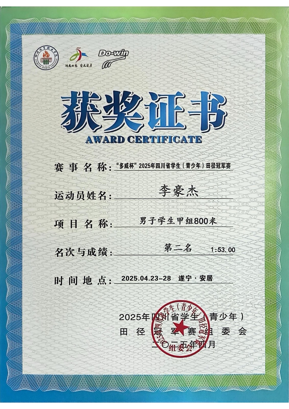 | 李豪杰 | “多威杯”2025年四川省学生(青少年)田径冠军赛 | 2025.4.23 | 2025年四川省学生(青少年)田径冠军赛组委会 | 第2名 | 男子学生甲组800米 | 高23级5班 | 余江 金开荣 |