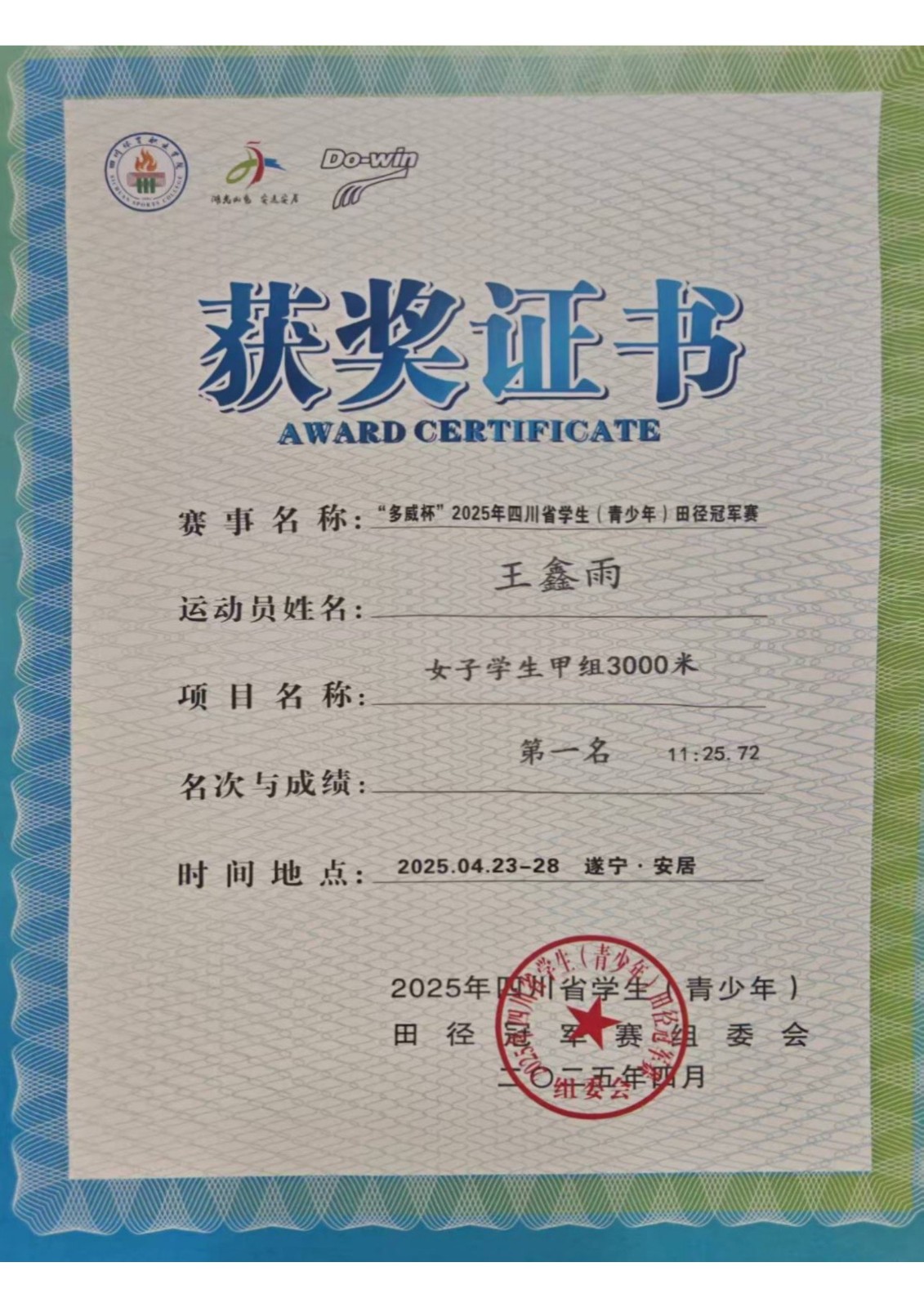 | 王鑫雨 | “多威杯”2035年四川省学生(青少年)田径冠军赛 | 2025.4.23 | 2025年四川省学生(青少年)田径冠军赛组委会 | 第1名 | 女子学生甲组3000米 | 高22级5班 | 余江 金开荣 |