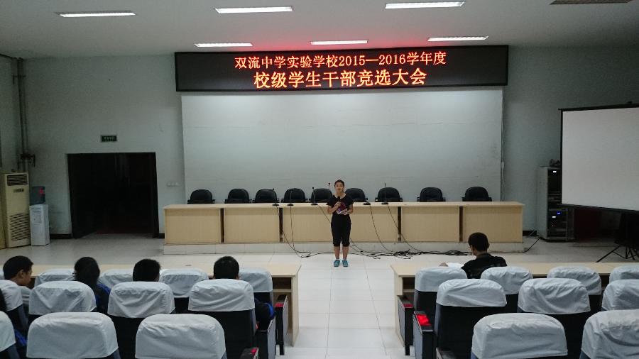 2015年9月21日晚5:50,我校2018届校学生会干部竞选大会在学术厅隆重举行。此次大会在德育处王俊老师发言后正式开始,竞选考评人员有学校德育处王敏蓉副主任、王俊老师、黄德洪老师、吴益锋老师以及校学生会主席王宇晨、团校委副书记邹静等同学组成的学生评委团。整个竞选活动秉承着“公平、公正、公开”的原则择优选取新学生会成员。