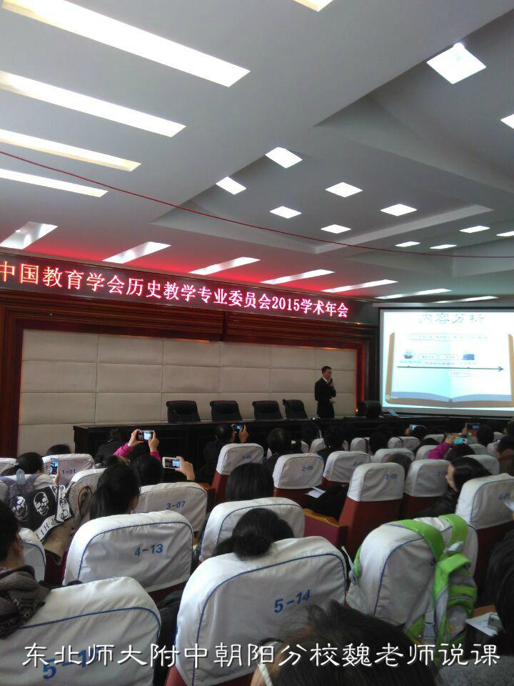 简洁而高效的开幕式后,是两位全国优质课一等奖获得者的公开课示范,分别是来自四川省成都七中育才学校的叶德元老师的《风云儿女》和天津开发区二中白玉老师的《开放格局的初步形成》。下午分主会场和分会场,都是教学片段一等奖获得者的录像展示和教师的现场说课,主会场有东北师大附中曲虹老师的《美术的辉煌》、河北邯郸一中耿学良老师的《中国古代的商业经济》、上海徐汇区西南模范中学宫毅老师的《清末新政》、北京人大附中分校的张丽琴老师的《美国联邦政府的建立》;分会场有北京大兴第三中学于飞老师的《莫高窟里的大唐》、东北师大附中朝阳分校魏龙环老师的《残酷的三角贸易》、湖南省常德市十一中易晓兰老师的《明朝君权的加强》、浙江诸暨中学吴森兵老师的《马戛尔尼访华—盛世危机》。几位老师的展示课各有特色,但都设计新颖又富有历史味,颇有价值。课后是华南师范大学黄牧航教授和人大附中李晓风特级教师进行了点评,黄教授从“教什么”、“怎么教”、“以怎样的观念教”三个方面入手,结合课改历程指出中学历史教学的成功和不足之处;李老师结合自己的教学实践、尤其是多年高三教学的实践进行了非常接中学历史教学“地气”的评课,引发了广大与会教师的思考。