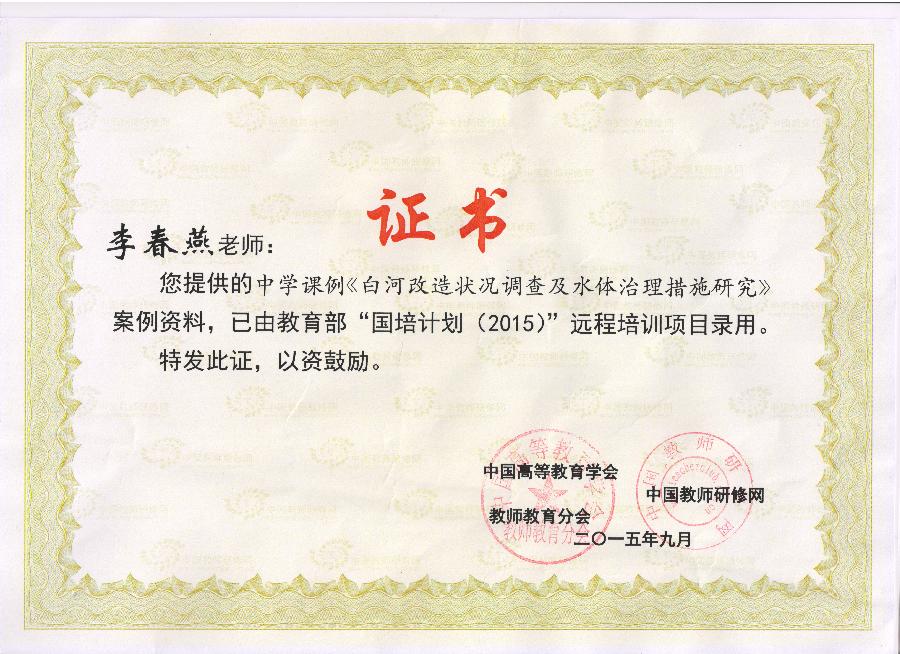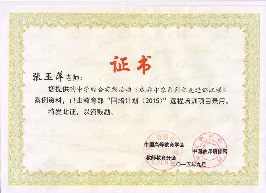2015年12月1日,我校收到2张教育部“国培”远程项目录用证书:李春燕老师所指导的小组研究性学习课题《白河改造状况调查及水体治理措施研究》、张玉萍老师指导的综合实践活动《成都印象系列之走进都江堰》案例资料被教育部“国培计划(2015)”远程培训项目录用。这是我校继2015年10月“泉州会议”上“课题化建构、探究性实施、表现性评价”引领全国综合实践活动向纵深发展后的又一殊荣。