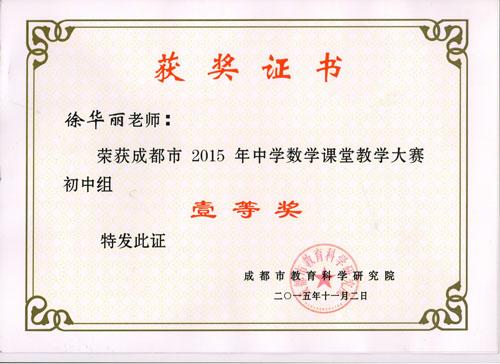 2015年11月2日,成都市“数学课堂教学大赛”颁奖仪式在成都市教育科学研究院隆重举行,我校徐华丽老师获一等奖。