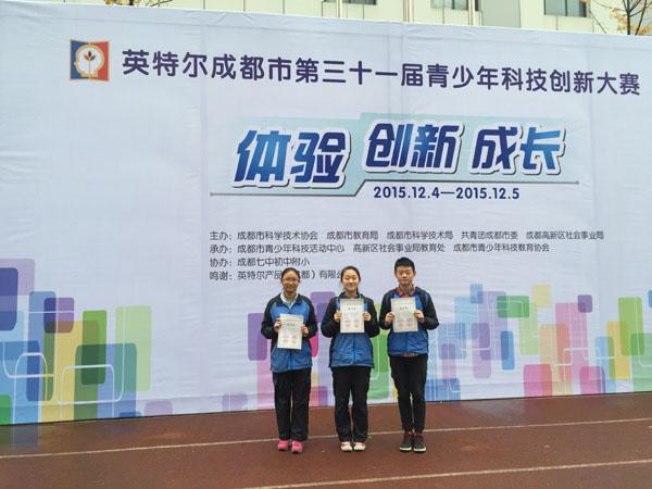 2015年12月3日—5日,第31届成都市青少年科技创新大赛在成都七中附属实验小学召开。我校学生在这届大赛中表现突出,科学论文和创造发明共十项作品进入最后答辩程序。入选的学生精心准备答辩和作品。经过专家评委会的考评,我校2016级17班学生向欣悦、王景、2016级19班学生付泽雄共同完成的科学论文《中国计划生育政策的调查研究报告》获得本届大赛的最高奖项—英才奖(由熊梓羽老师指导)。其余九项参赛作品也均荣获大赛一等奖。