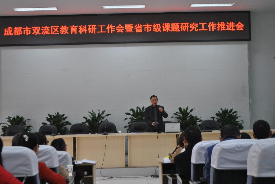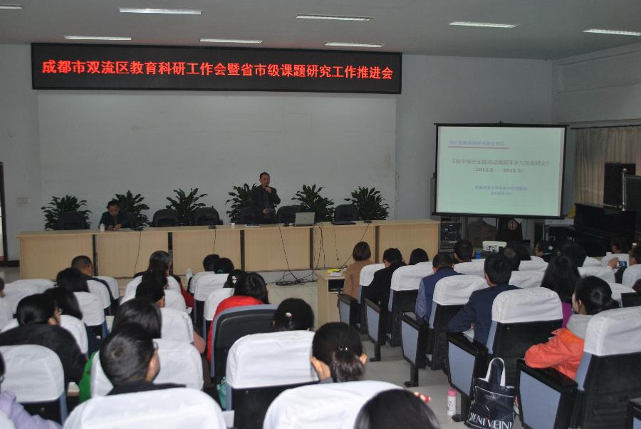 2016年3月16日上午, “成都市双流区2016年教育科研工作会暨省市级课题研究工作推进会”在我校学术厅召开。参加本次会议的有双流区研培中心主任邱刚田,研培中心理论室主任易恩及理论室全体成员、双流区教育科研中心组成员以及23个省市级课题项目学校的课题负责人和主研人员,以及部分校长和各级各类学校教科室主任共计100余人。