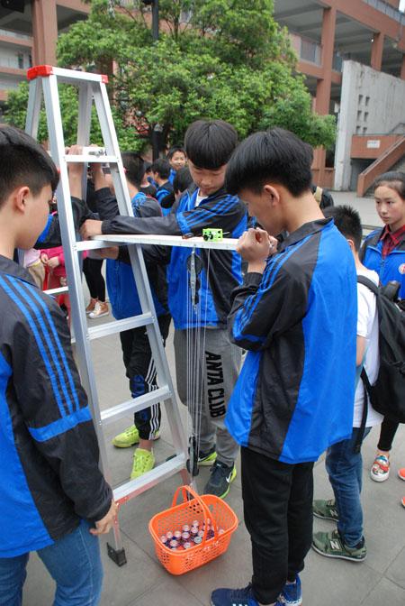 重物提升比赛是我校首次开发的一个学生创意项目,也许大家看到过一节5号电池驱动小电风扇工作,也看到过一节5号电池驱动玩具车工作,但很难想象用一节5号电池驱动小电动机能提起很多的重物,并让其上升到一定的高度,这听起来不可思议的事情,我们的学生利用自己的智慧和动手实践能力成功将其实现了。